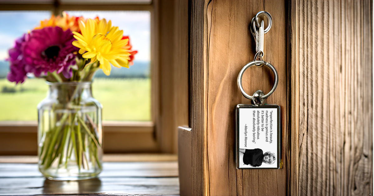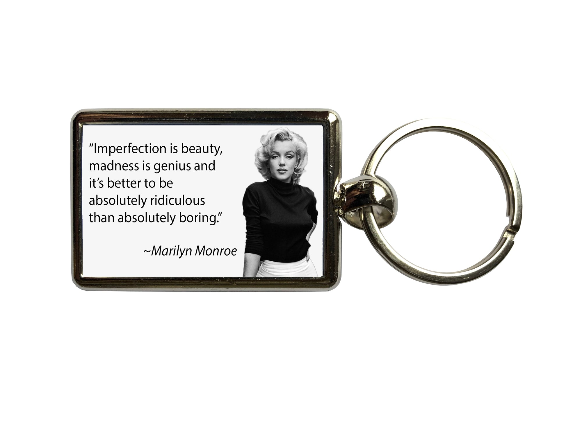 Carry a touch of Hollywood glamour with this Marilyn Monroe Quote Metal Keyring, featuring her iconic phrase, "Imperfection is beauty, madness is genius, and it's better to be absolutely ridiculous than absolutely boring." A perfect accessory for Marilyn Monroe fans, vintage lovers, and those who appreciate timeless wisdom with a stylish twist.